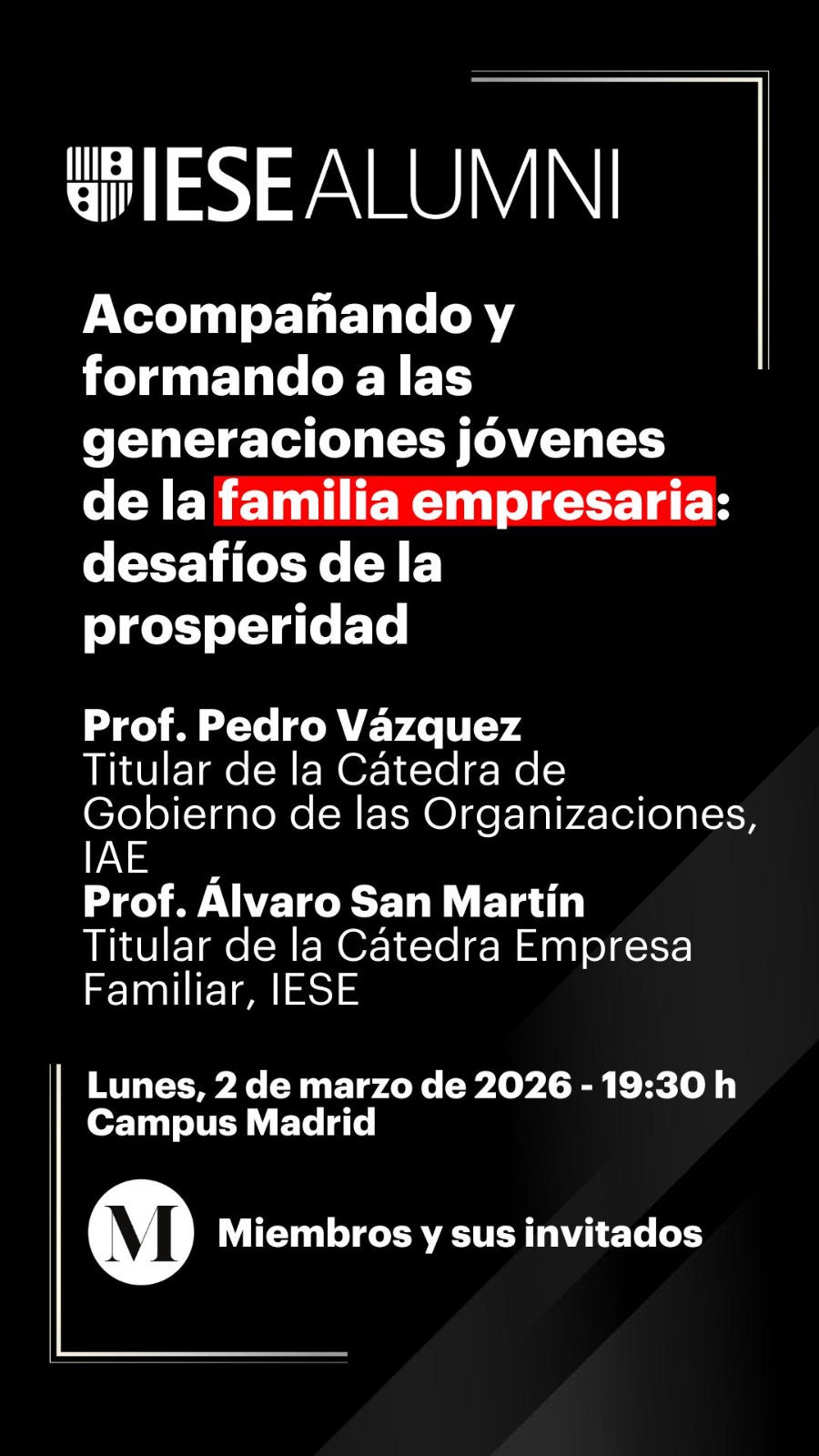 Led by IAE Prof. Pedro Vázquez, the Spanish-language session will explore the opportunities, risks and educational considerations involved in preparing next-generation members to responsibly steward both wealth and family values.
