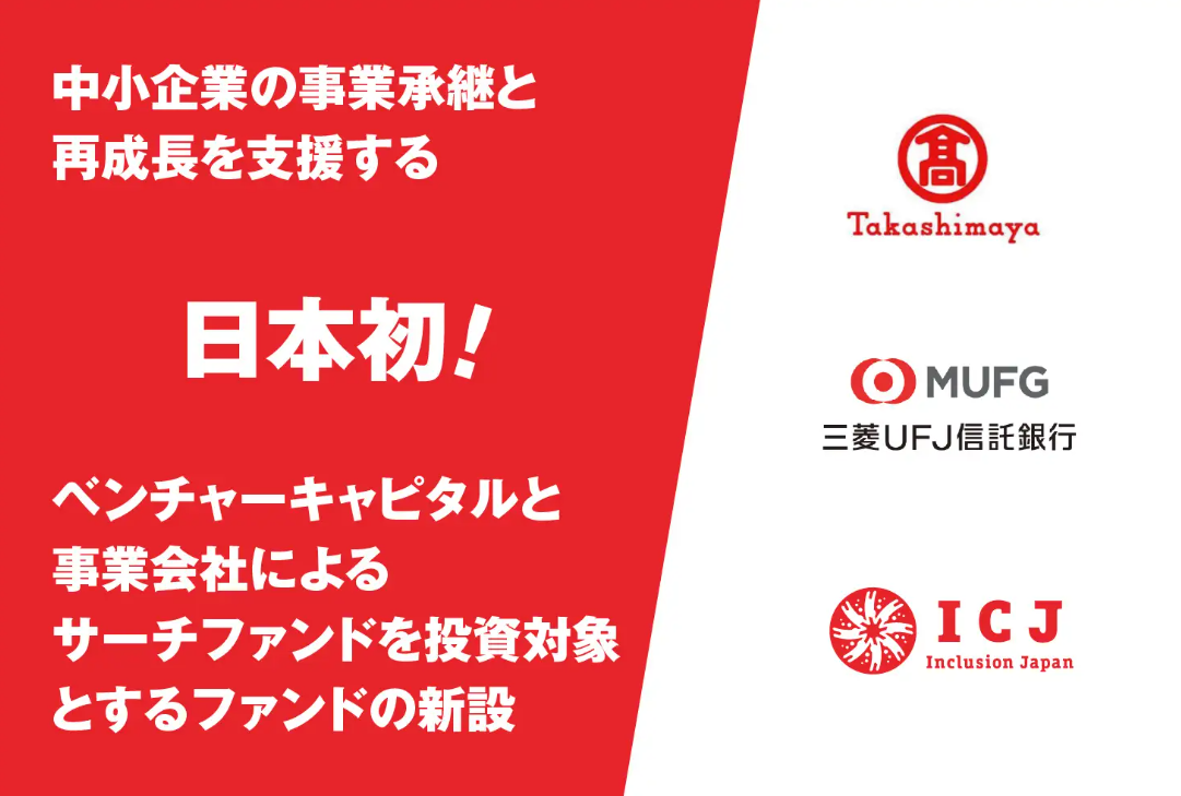 インクルージョン・ジャパン株式会社が、日本のベンチャーキャピタルとして初めて、サーチファンドを投資対象とするICJ 1号ファンド オブ サーチファンド投資事業有限責任組合を組成し、株式会社高島屋と三菱 UFJ 信託銀行株式会社が出資契約を締結しました。