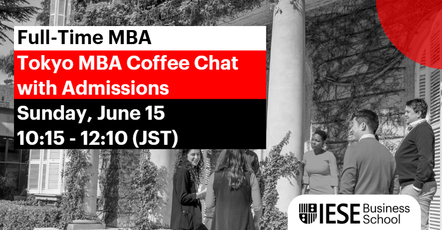 - IESE MBA Class of 2016の卒業生でもある日本人アドミッションオフィサーの西田(アジア統括、LinkedIn)が、最大3名の受験生を同時にお迎えして、プログラム、キャリア機会、入学審査プロセス、バルセロナ生活等、幅広く個別の疑問にお答えします(50分)。