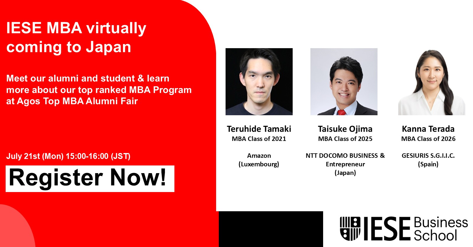 - IESE MBA Class of 2016の卒業生でもある日本人アドミッションオフィサーの西田(アジア統括、LinkedIn)が、MBA Talk、Meetup、Networking Fairに参加します。