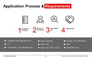 IESEの入学審査は、旧式の大学受験よりも就職活動の色が強いです。スコアメイクのみに囚われるのではなく、毎月更新される受験生向けイベントを参照して、早いうちからIESEが主催するイベントに、世界全体向け・日本限定向けを問わず参加するようにして、学校への理解と自分自身の動機を深めましょう。