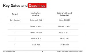 早いラウンドでの出願が有利となる奨学金と異なり、入学審査委員会として、ラウンドごとの最低合格基準が流動しないよう注意を払っているため、どのラウンドで出願したから合否に有利ということは特にありません。例外は最後のラウンドである第4ラウンドで、多様性にバランス良く富んだクラスの策定のために調整色が強くなり、外部要素に左右される可能性がやや高くなります。