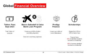 MBA Class of 2028の学費は、総額€114,000です。Flexible TrackでもTraditional Trackでも学費は同じです。奨学金とローンとPPA(Post-Graduate Payment Aid)による支援があります。