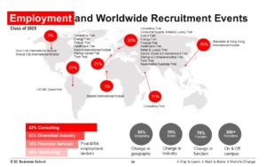 2025年の就職実績レポートによると、卒業後の進路として業種別には、コンサルティングが42%、金融が16%、テクノロジーが9%、ヘルスケア・エネルギー・小売などから構成されるその他が33%となっています。土地をMBA前から変えた卒業生が53%、業界が70%、職掌が79%となっています。就職実績の詳細については、就職実績レポートをご覧ください。