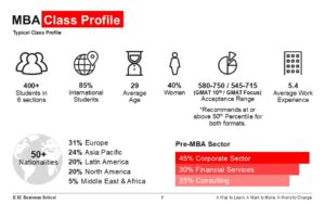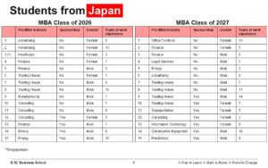 MBA前の業界としては、コンサル+金融で55%となっており、残りは、玉石混交となっているため、多様性が、国籍と職歴の双方に存在します。