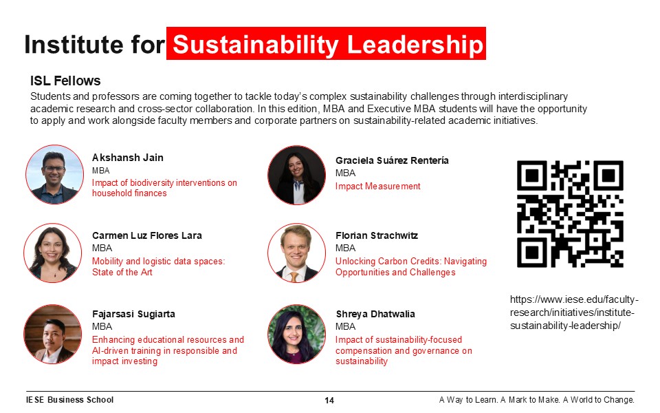 Institute for Sustainability for Leadershipの指揮のもと、様々な活動がなされています。特に、ISL Fellowsにおいては、学生と教授が一堂に会し、学際的な学術研究や異業種間の協力を通じて、今日の持続可能性に関わる複雑な課題に取り組みます。直近のプログラムでは、MBA及びエグゼクティブMBAの学生が、持続可能性に関連する学術的な取り組みにおいて、教授陣や企業パートナーと共に実践的に学び、協力する機会を得ました。