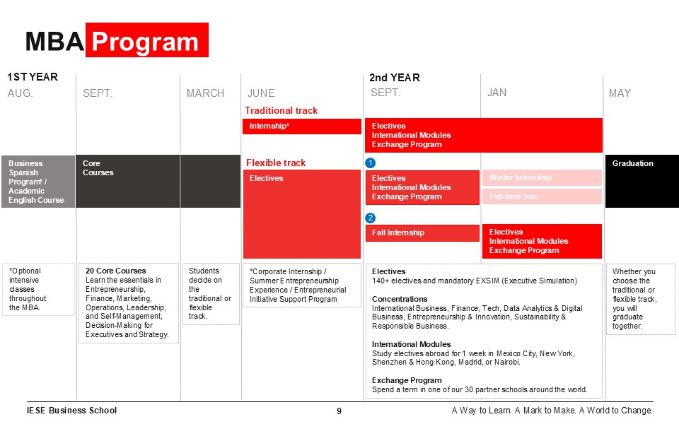 Tradtional TrackとFlexible Trackが提供されています。Flexible Trackにおいては1年目と2年目の間の夏季期間に選択科目を受講するのに対し、Traditional Trackにおいては異なります。