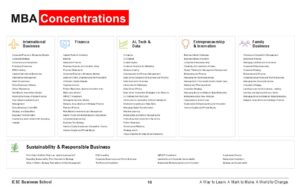 選択科目のうち一定数は、コンセントレーションとして提供されます。国際ビジネス、ファイナンス、人工知能・テック・データ、アントレプレナーシップ・イノベーション、ファミリービジネス、サステナビリティ・レスポンシブルビジネスの6領域のいずれかで一定単位数を取得すると、卒業時に、卒業証書とは別途、証明書を取得可能で、MBA採用企業などへの信号として効果を発揮します。